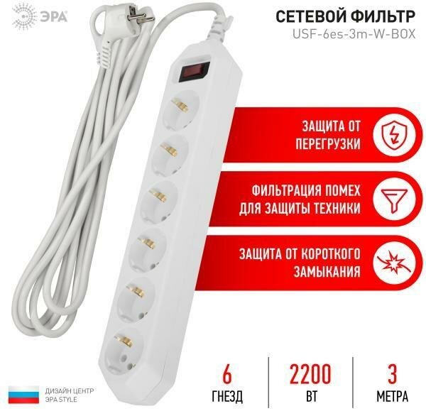 Сетевой фильтр ЭРА USF-6es-3m-W с базовой защитой с заземлением с выключателем 6 розеток 3м 10А белы информация: