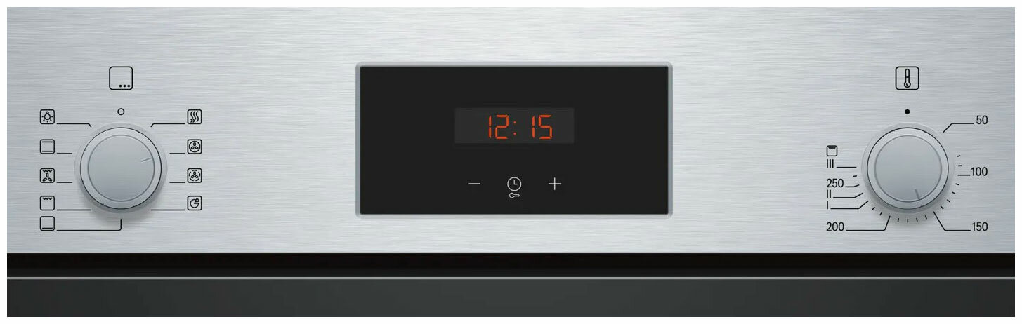 Serie 2, духовой шкаф, нержавеющая сталь, класс энергоэффективности А, 8 режимов, 3-х слойное остекление, LED-дисплей, поворотные переключатели, галогенное освещение, самоочистка EcoClean (задняя стенка), телескопические направляющие на 1-ом уровне, сдела