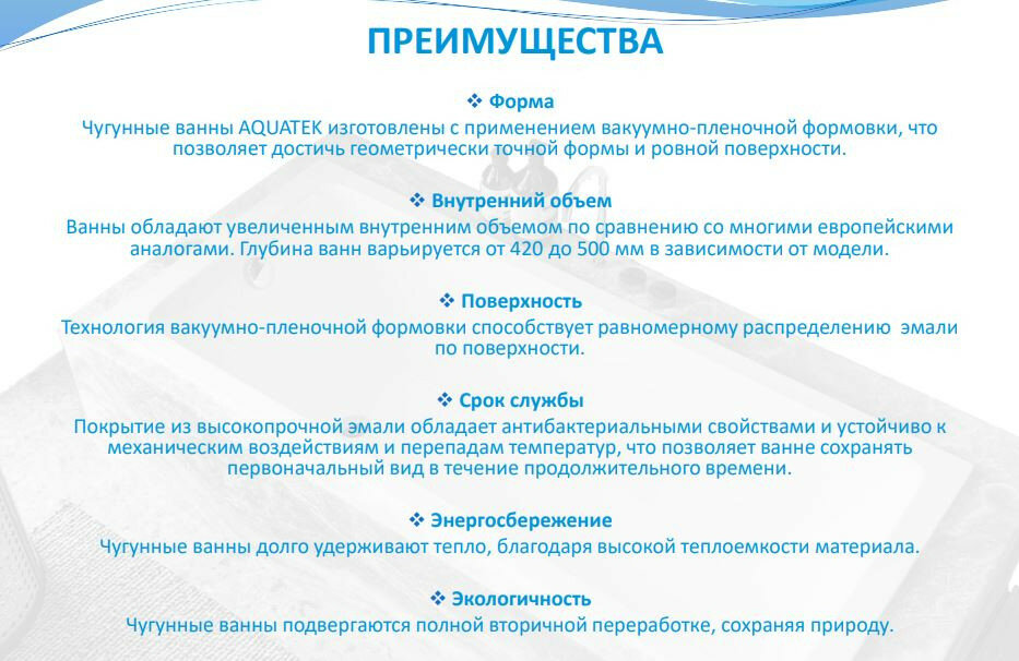 Ванна чугунная эмалированная AQUATEK гамма AQ8070FH-00 1700x750 в комплекте с 4-мя ножками и 2-мя ручками 45 813 ₽