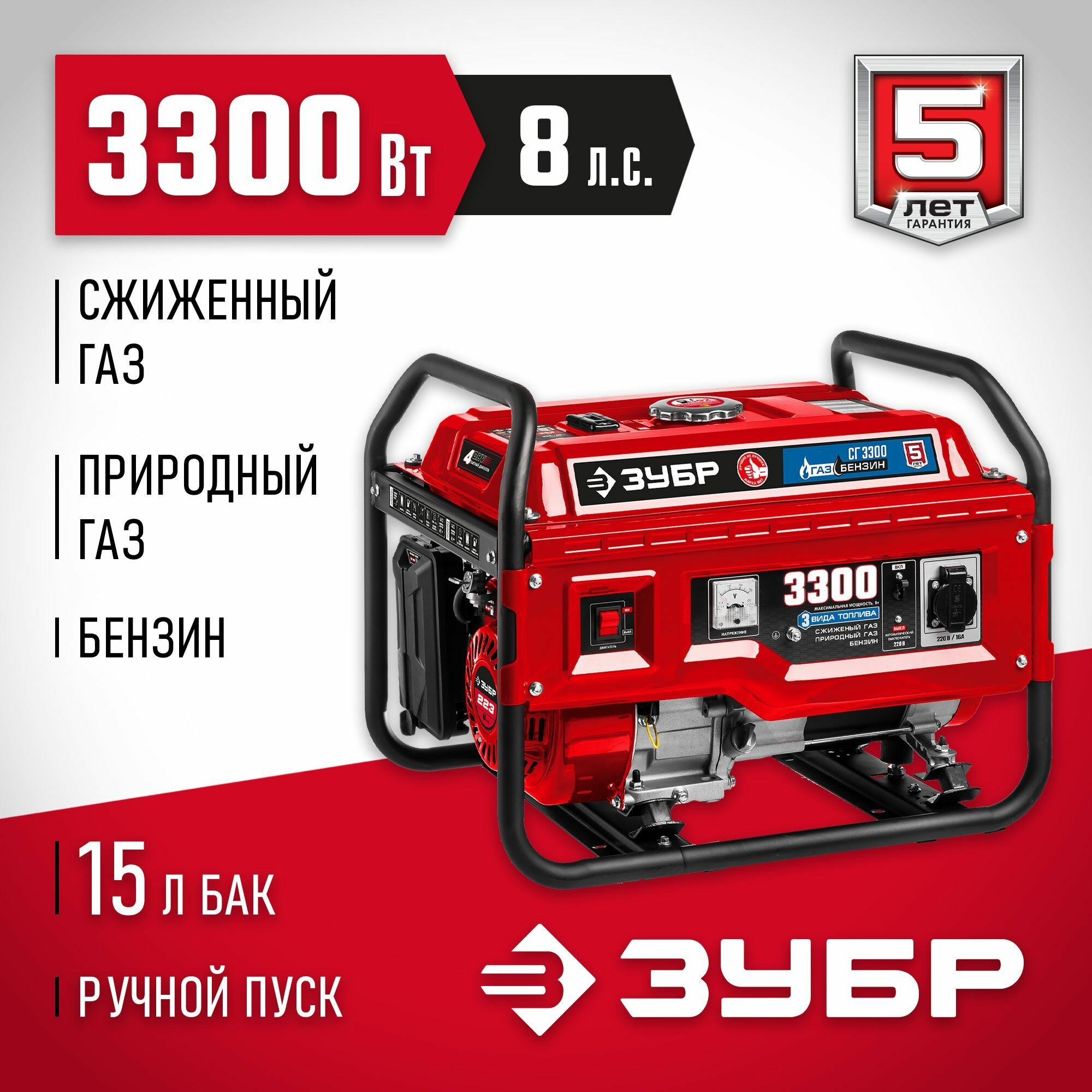Отзывы на ЗУБР 3300 Вт, газовый генератор (сжиженный газ / природный газ / бензин) (СГ-3300)