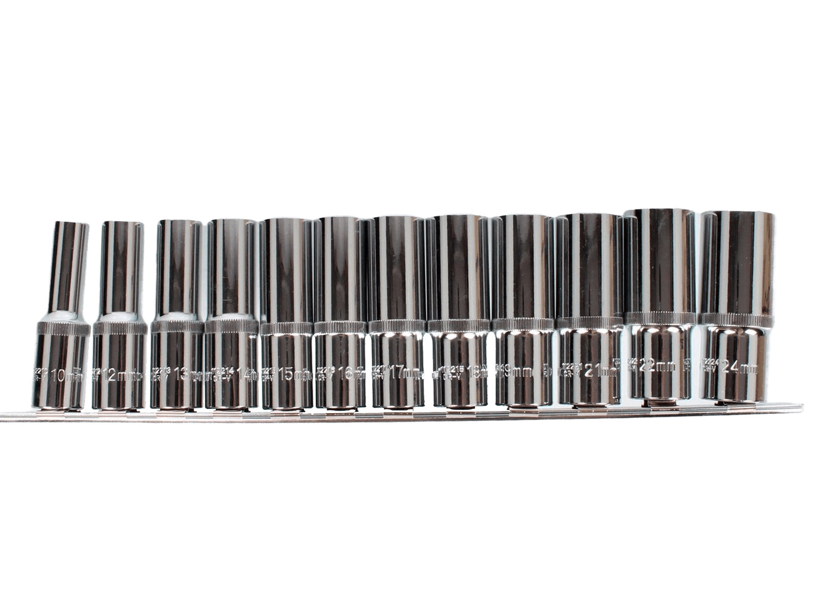 912212 Набор торцевых головок 12-гранных глубоких на держателе-рельс 1/2"DR 10-24 мм., 12 предметов