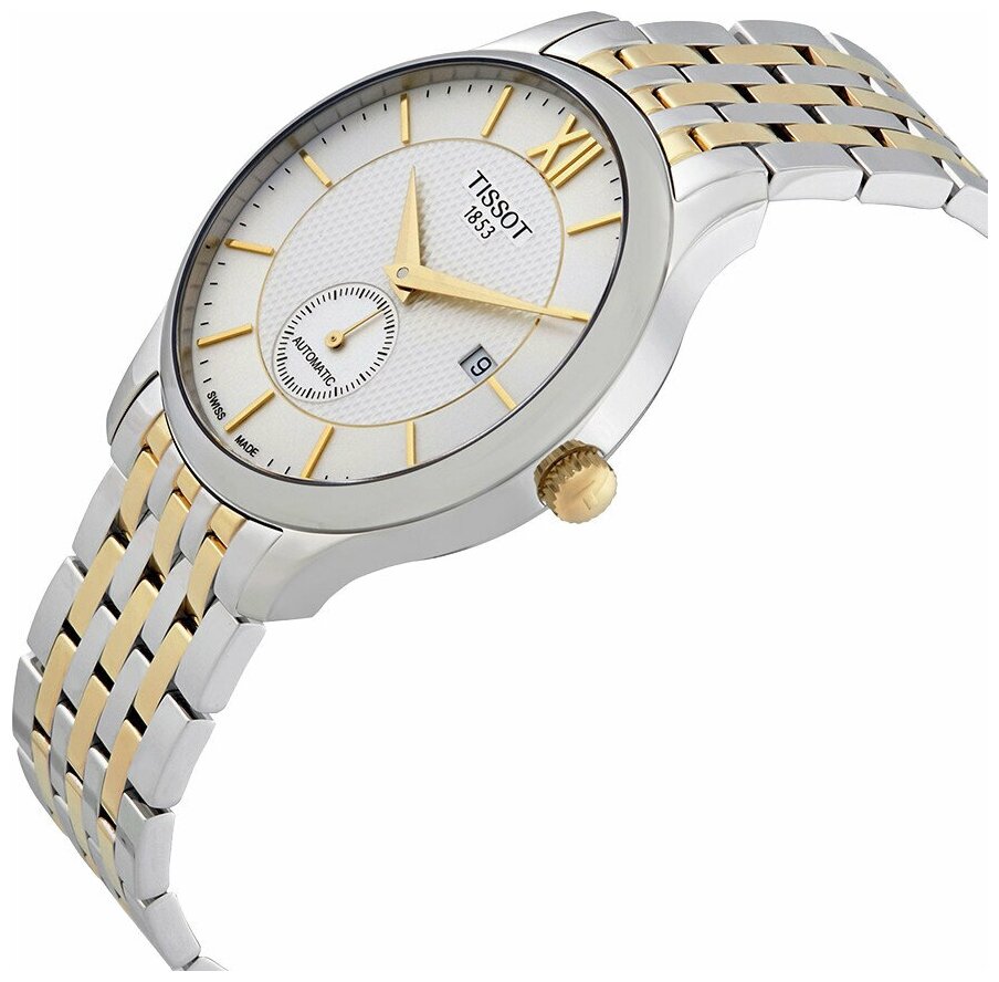 10 цен на Швейцарские механические часы с автопозаводом Tissot Tradition Automatic Small Second T063.428.22.038.00 на стальном браслете, с водозащитой 3 бара и международной гарантией от производителя