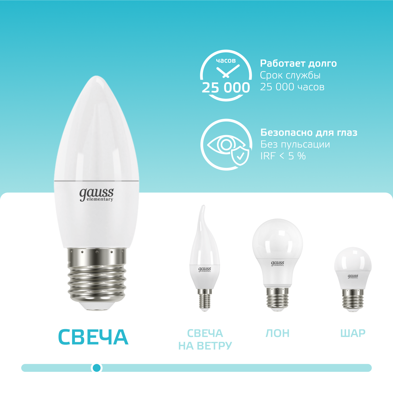 Светодиодная лампа Gauss Elementary 12W эквивалент 95W 4100K 950Лм E27 в форме свечи (комплект из 2 шт) информация: