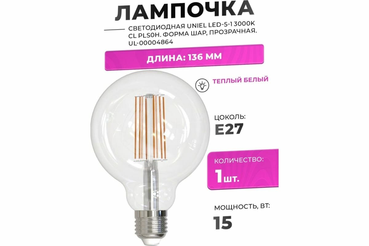 Uniel Led-g125-15w/3000k/e27/cl Pls02wh Лампа светодиодная. Форма шар, прозрачная. UL-00004860