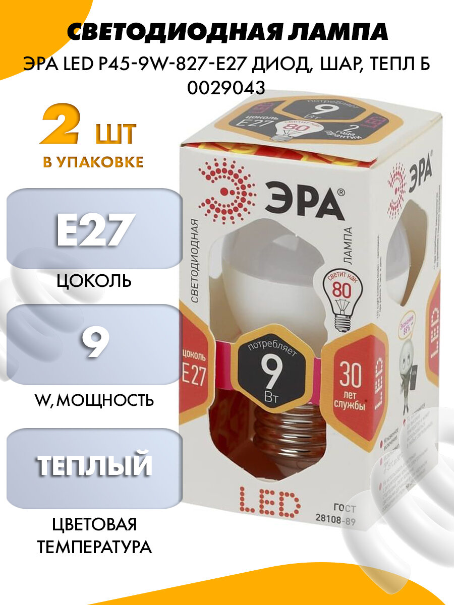 ЭРА LED P45-9W-827-E27 (диод, шар, 9Вт, тепл, E27) информация: