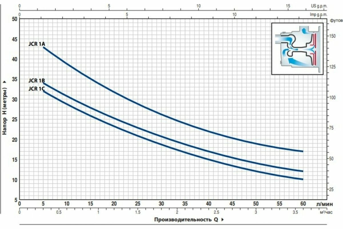 Насос самовсасывающий Pedrollo JCRm 1B (0,48 кВт, 1x230 В, PN6, Qmax 60 л/мин, Hmax 39,5 м) информация: