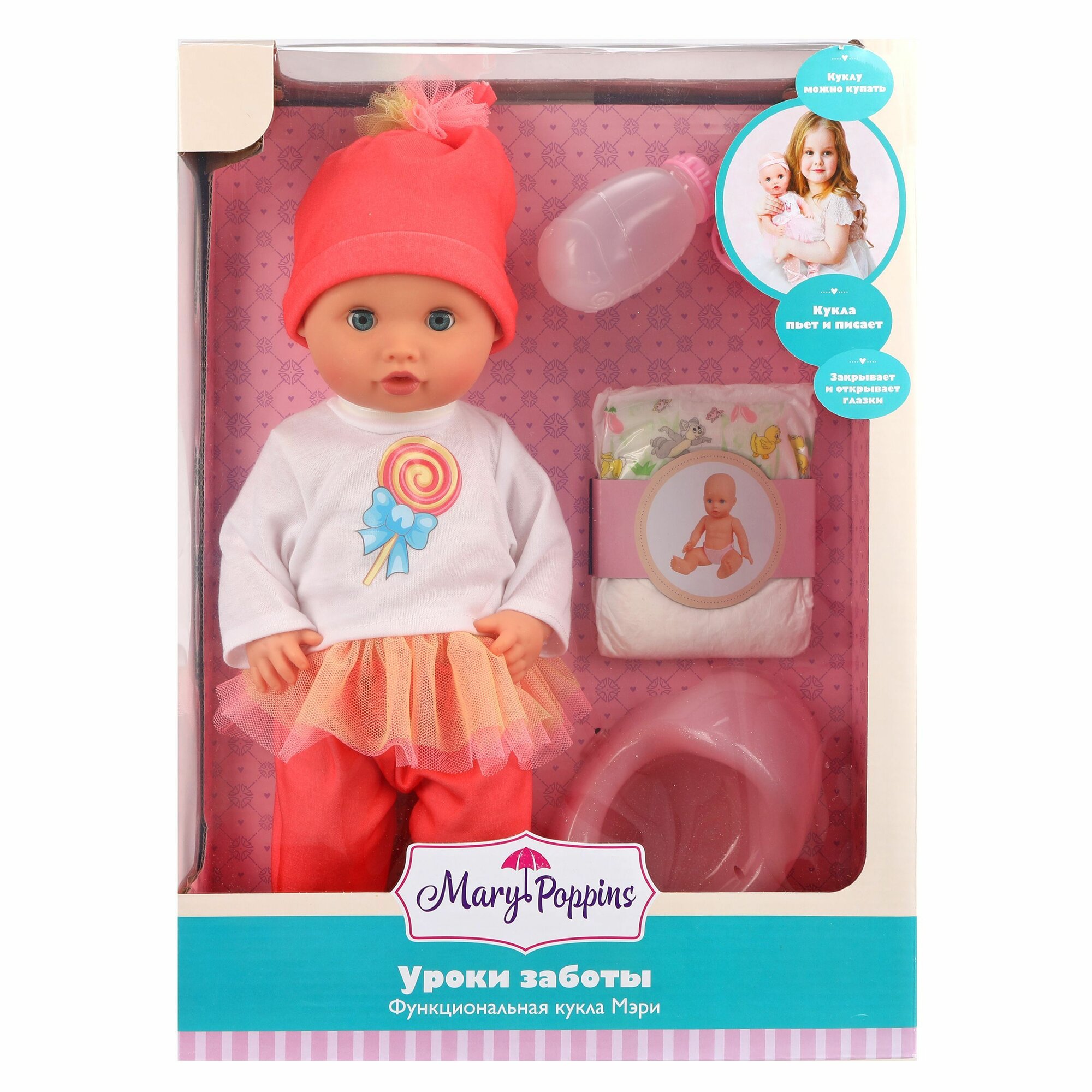 Пупс "Mary Poppins" Мэри, Уроки заботы 451276, пьет, писает, 36см, ПВХ, пластик, текстиль 2 071 ₽