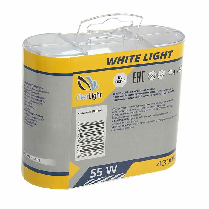 Лампа автомобильная Clearlight WhiteLight, H1, 12 В, 55 Вт, набор 2 шт информация: