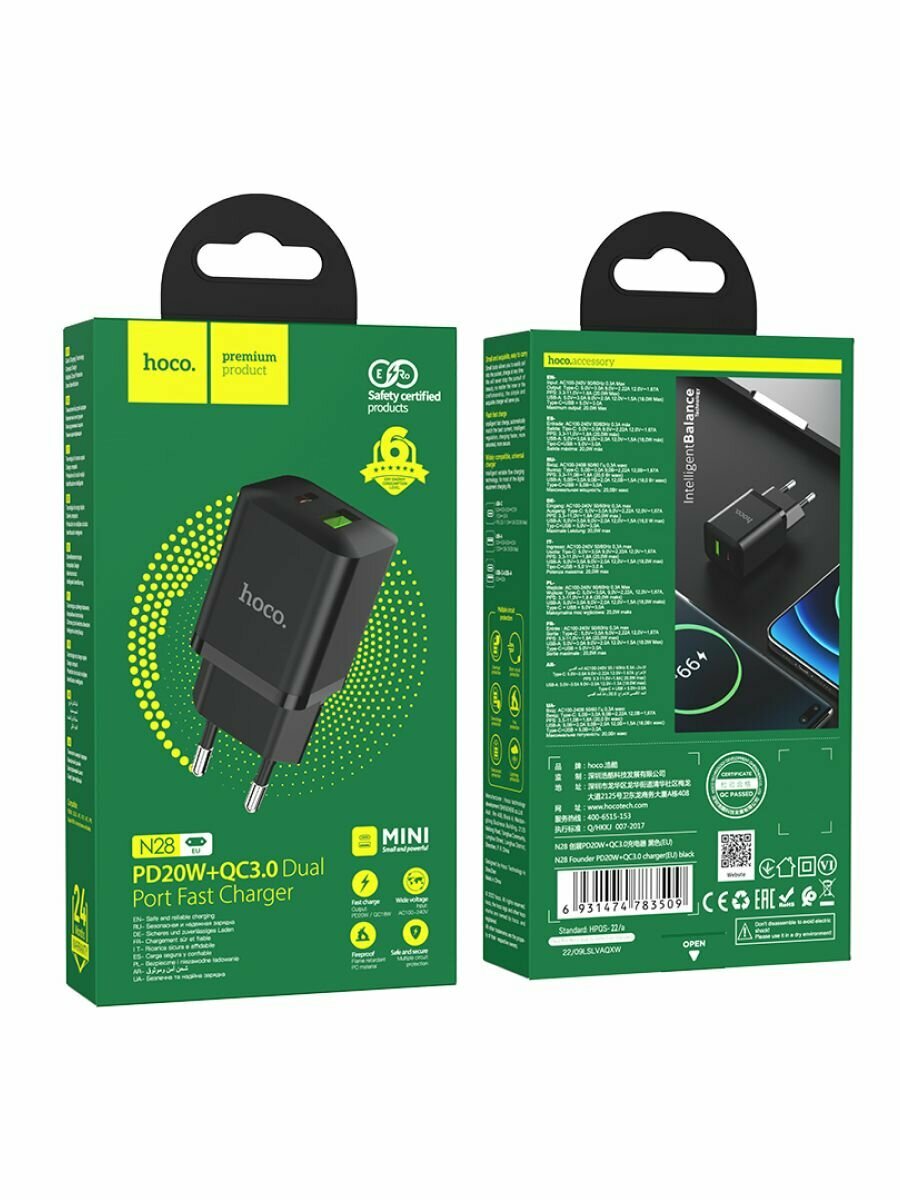 Быстрое сетевое зарядное устройство Hoco N28 Founder QC3.0 PD 20W информация:
