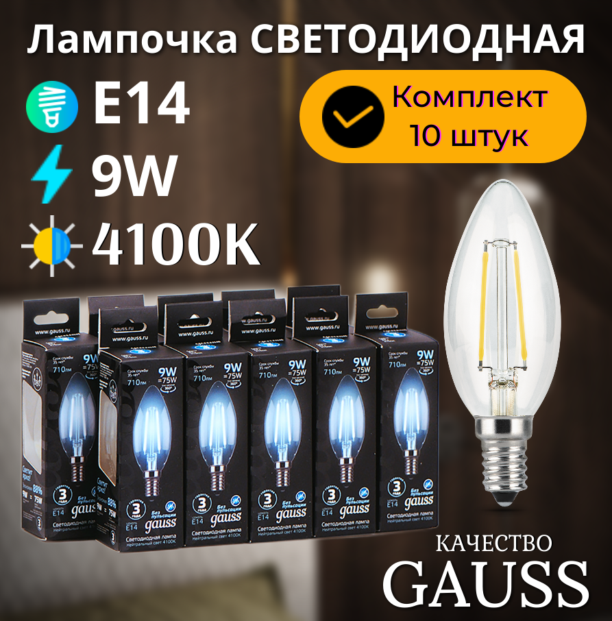 Упаковка ламп филаментная GAUSS E14, свеча, 9Вт, 4100К, белый нейтральный, 10 шт. [103801209]