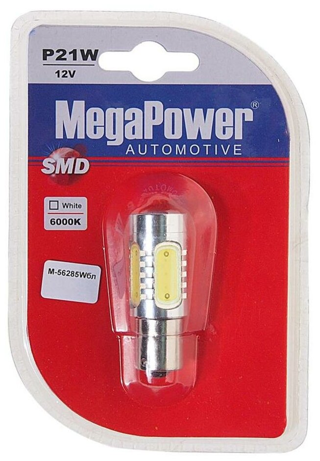 MEGAPOWER-AUTOMOTIVE 56285WБЛ Лампа светодиодная 12V P21W BA15s 6000K 5 светодиодов блистер (1шт.) MEGAPOWER
