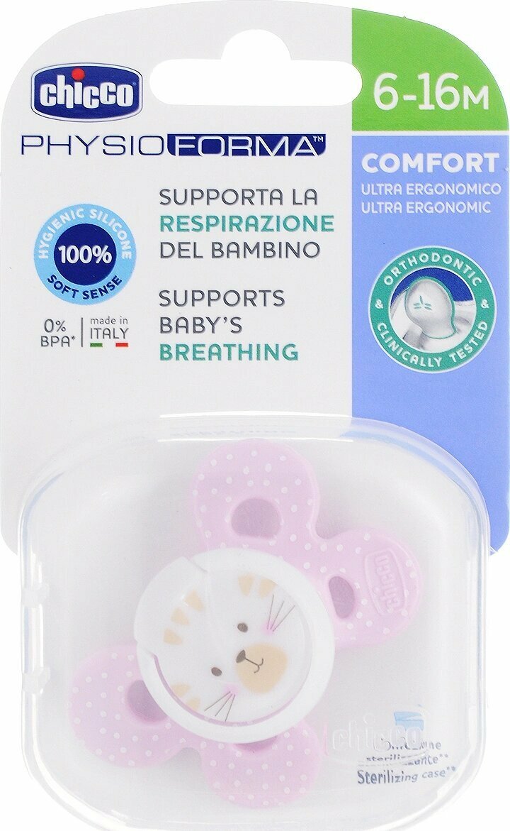Соска-пустышка силиконовая ортодонтическая котик 6-16 мес. Physio Comfort Chicco/Чикко 390 ₽