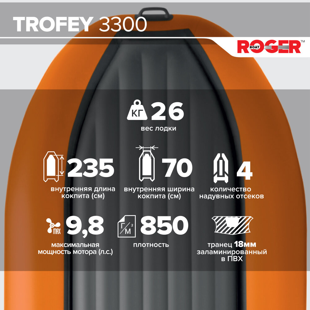 Лодка надувная ПВХ под мотор ROGER Trofey 3300, лодка роджер НДНД (графит-оранжевый) информация: