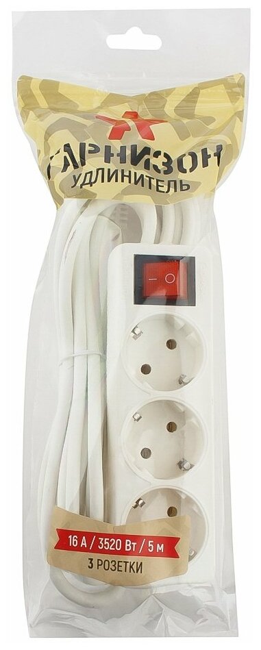 Удлинитель Гарнизон ELB-G3-W-5, 3 евророзетки с выключателем и заземлением, допустимый ток 16 А, длина 5 м 1 514 ₽