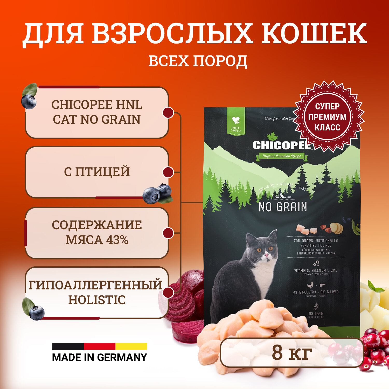 Chicopee HNL Cat No Grain сухой беззерновой корм для кошек с чувствительным пищеварением 8 кг информация: