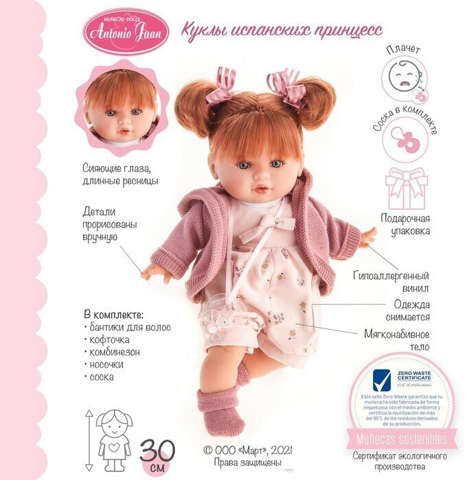 Кукла пупс реборн озвученная мягконабивная Antonio Juan 13144 Оливия с соской, 30 см, с одеждой и аксессуарами, с волосами, плачет и говорит информация: