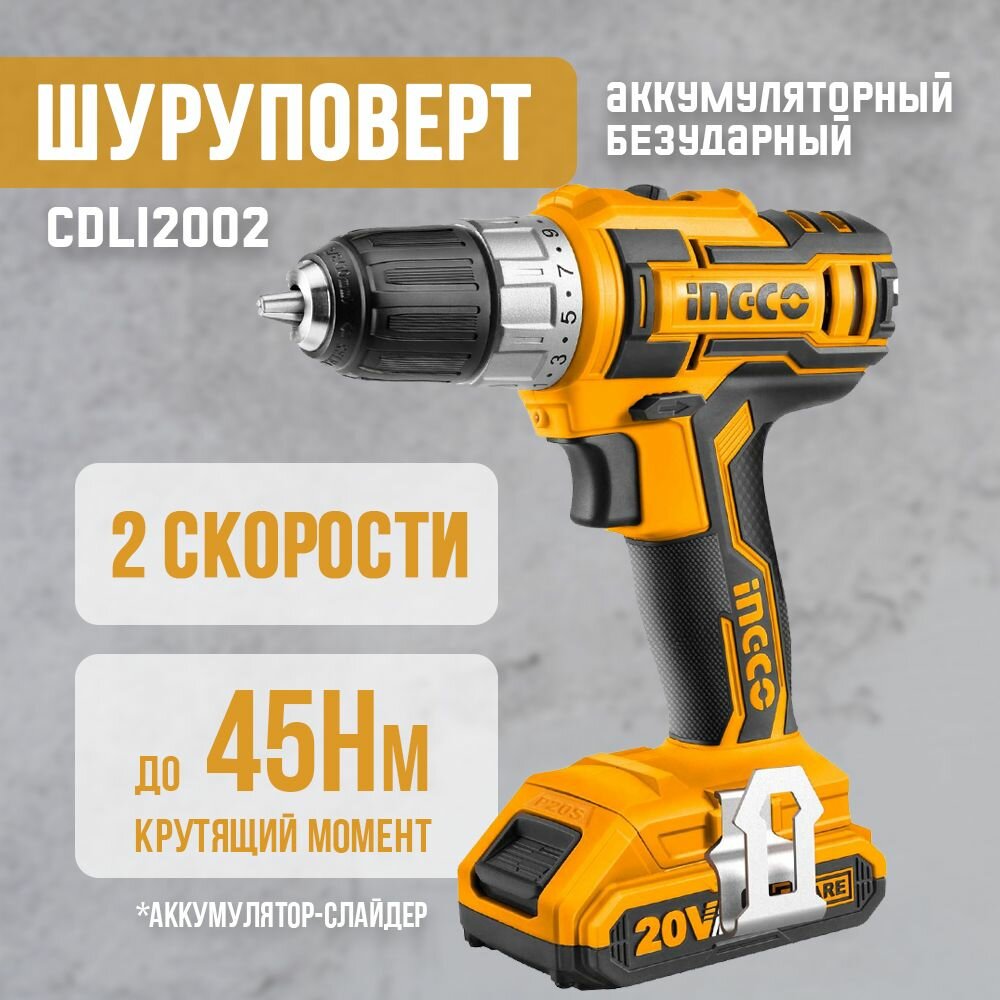 Шуруповерт INGCO Li-lon 20.0 В, 2 Ач, 45 Нм, 2 АКБ, патрон 10мм, сумка, CDLI2002 информация: