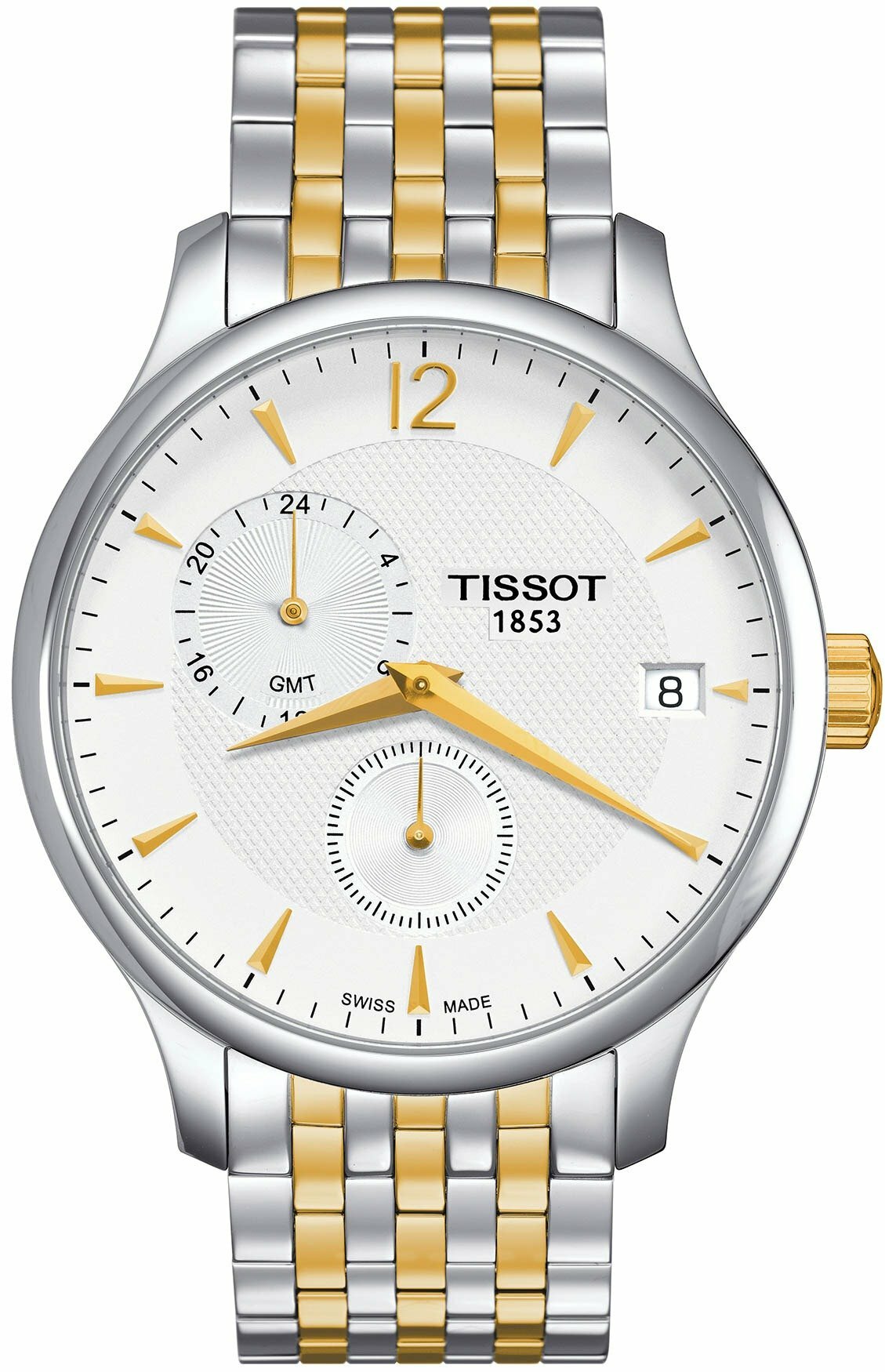 10 цен на Швейцарские кварцевые часы Tissot Tradition Gmt T063.639.22.037.00 на стальном браслете, с водозащитой 3 бара и международной гарантией от производителя