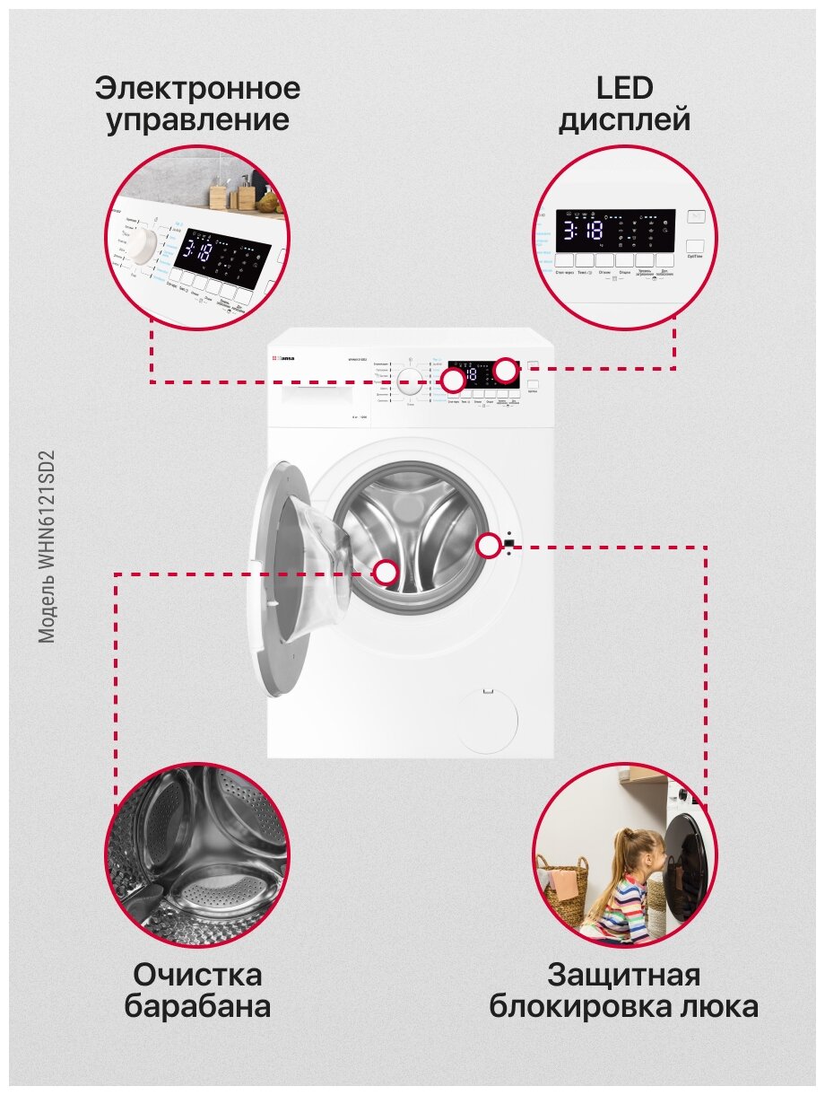 Стиральная машина Hansa WHN6121SD2, с загрузкой 6 кг, 16 программами, блокировкой управления, электронным управлением, функцией пара (Steam Touch), отпариванием и отсрочкой окончания.