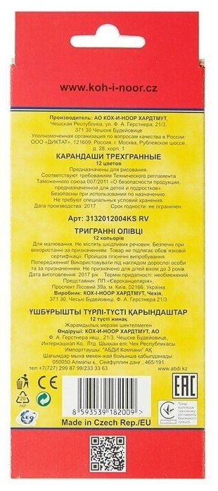 Карандаши цветные KOH-I-NOOR "Triocolor", 12 цветов, трехгранные, грифель 3,2 мм, европодвес, 3132012004KSRU В комплекте: 1шт.