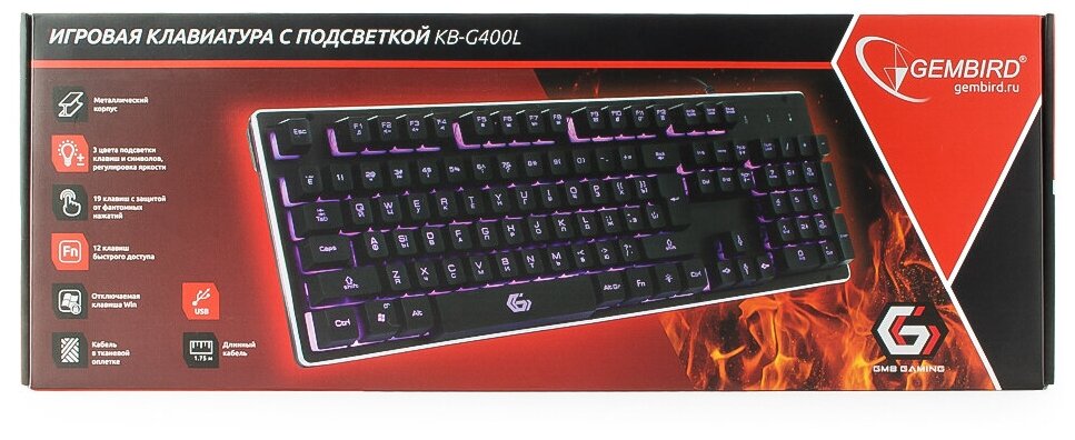 Клавиатура игровая Gembird KB-G400L, USB, черный, металлический корпус, 104 клавиши, подсветка 3 цвета, FN клавиши, кабель тканевый 1.75 м
