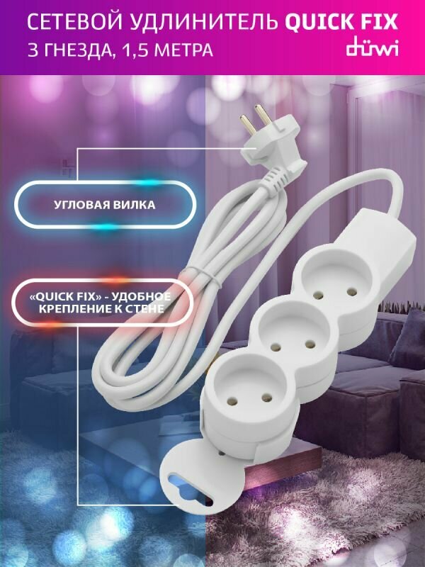 Удлинитель DUWI 32001 4 3 розетки, 1,5м, белый