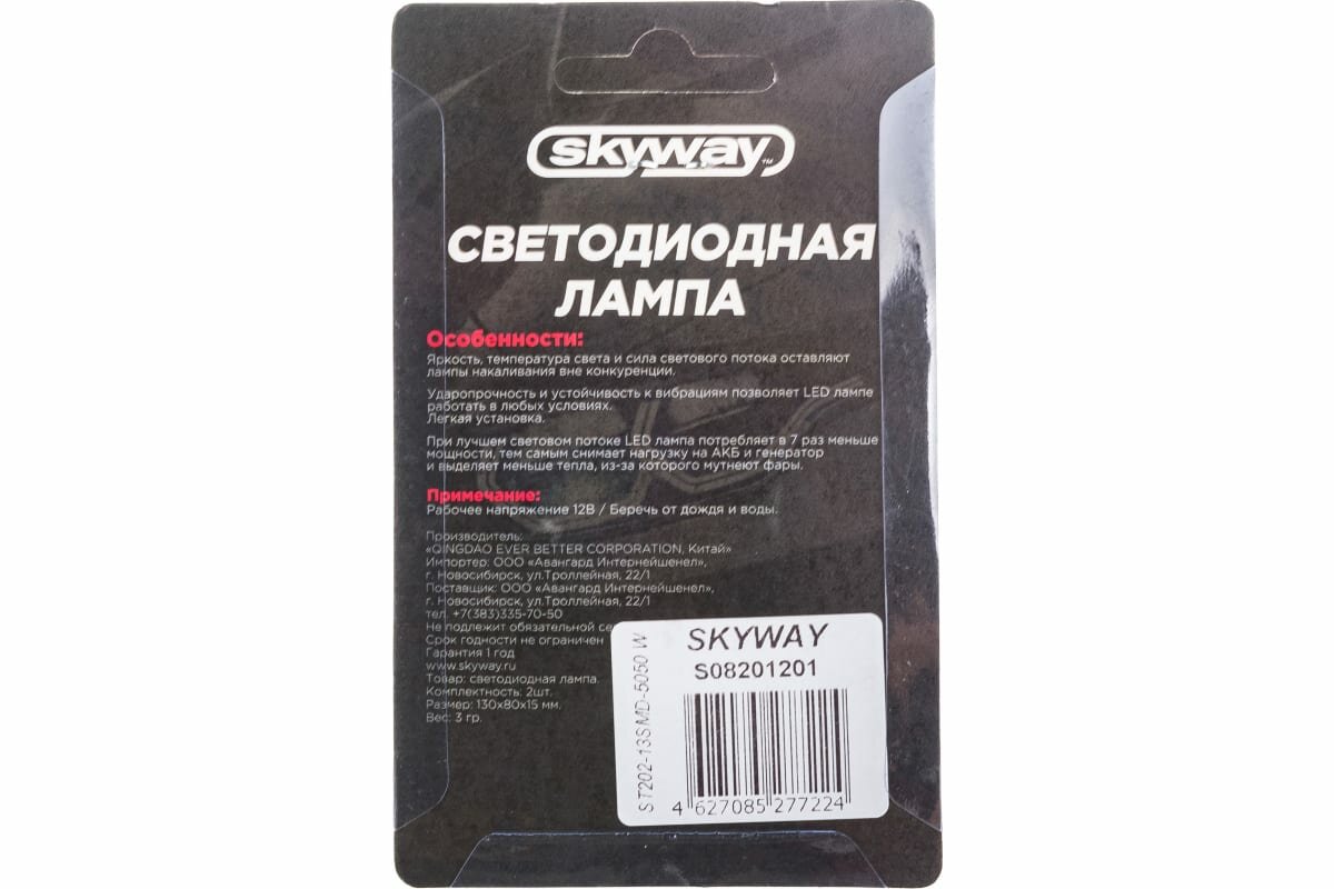 Лампа светодиод 12V Т20/5(W21/5W) SKYWAYбез цоколя, 13 SMD,белая, 2-конт. 2шт. (S7443-1350В блистер