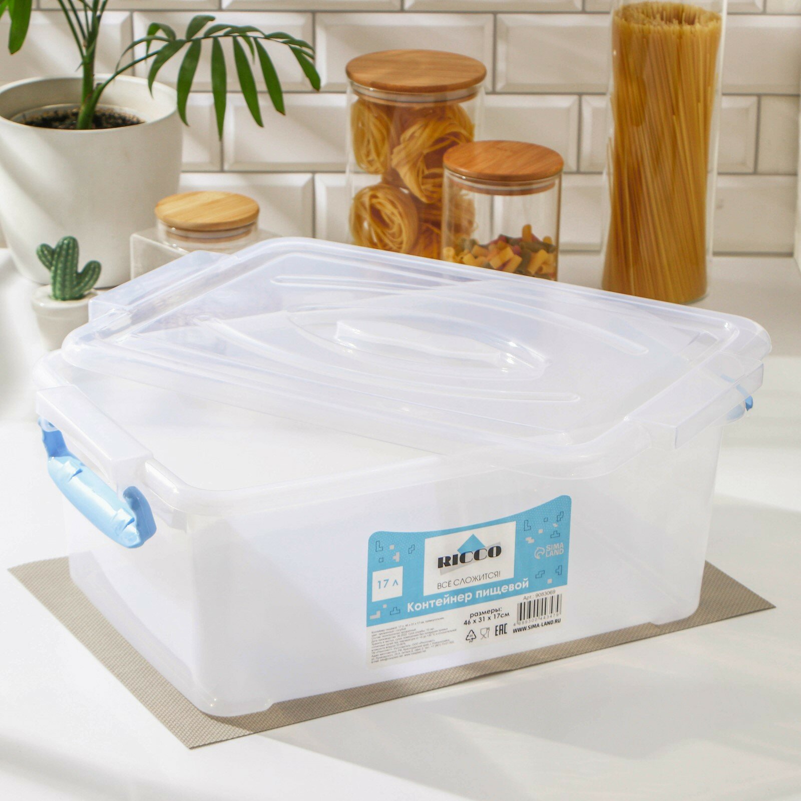 Контейнер пищевой RICCO, 17 л, 46×31×17 см, прямоугольный, цвет прозрачный, голубой (1 шт.)