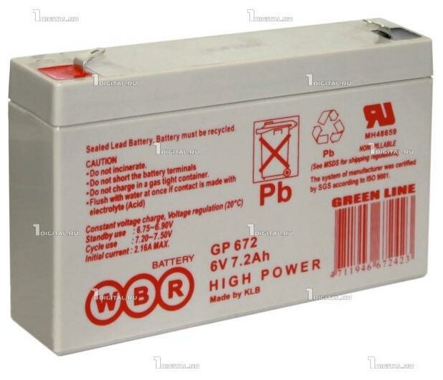 | Дополнительная информация | WBR GP-672- герметизированные, выполненные по технологии AGM, батареи общего применения со сроком службы до 7 лет в буферном режиме. Эти высокоэффективные перезаряжаемые батареи не требуют обслуживания в течение всего срока службы. |