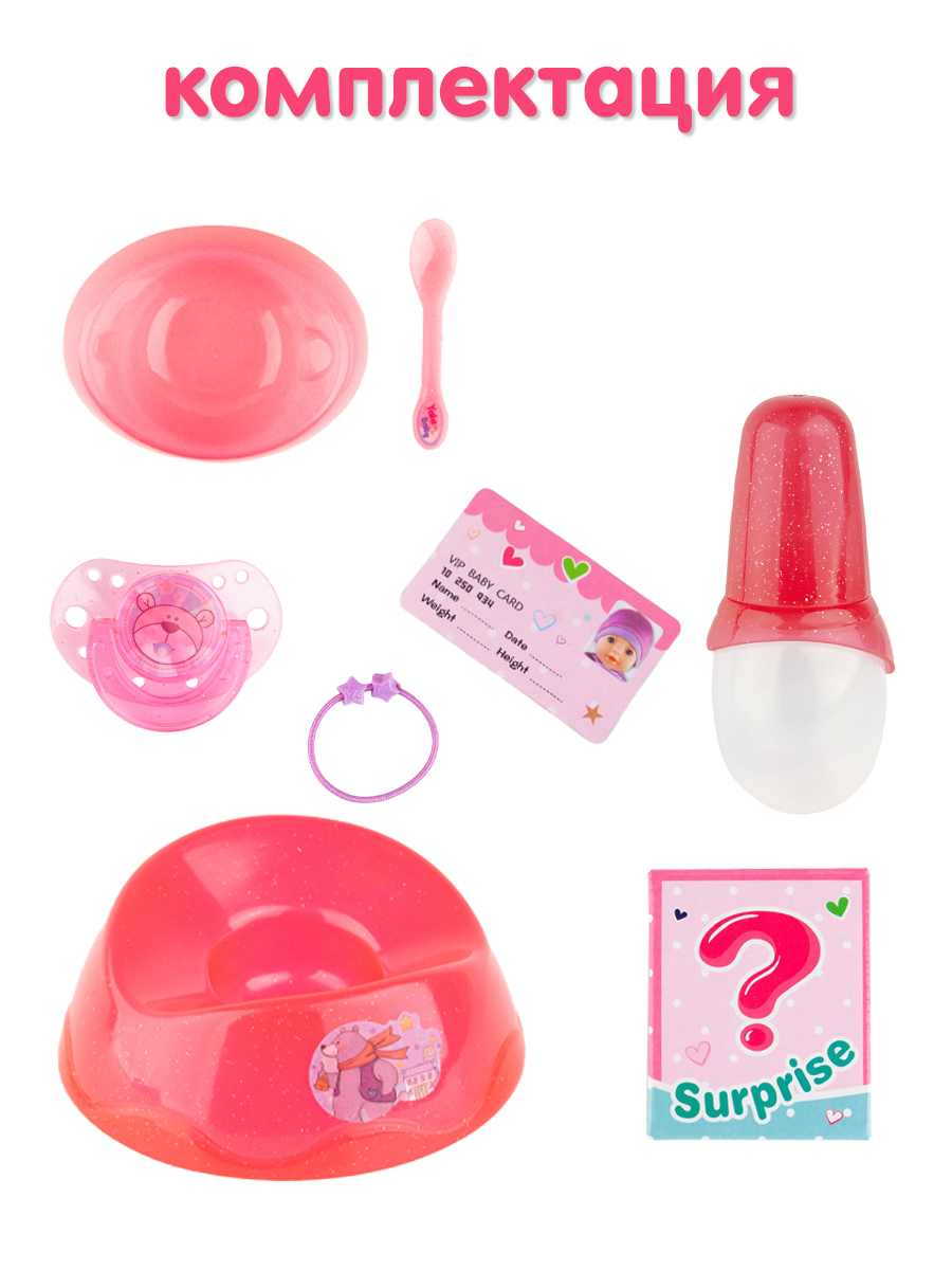 | Комплектация | бутылочка для кормления, горшок, тарелочка для кормления (1шт.), ложка для кормления (1шт.), соска, подгузник (1шт.), карточка куклы (1шт.), каша для куклы (2шт.), браслет (1шт.) |