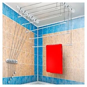 | Комплектация | кронштейн с роликами - 2 шт., веревка с фиксирующим кольцом на одном конце - 6 шт., штанга-трубка для размещения белья - 6 шт., пластиковая заглушка на кронштейны - 4 шт., стопорная планка - 1 шт., штанга с крючком для захвата колец из верхнего положения и перемещения к стопорной планке - 1 шт., саморез - 6 шт., дюбель - 6 шт |