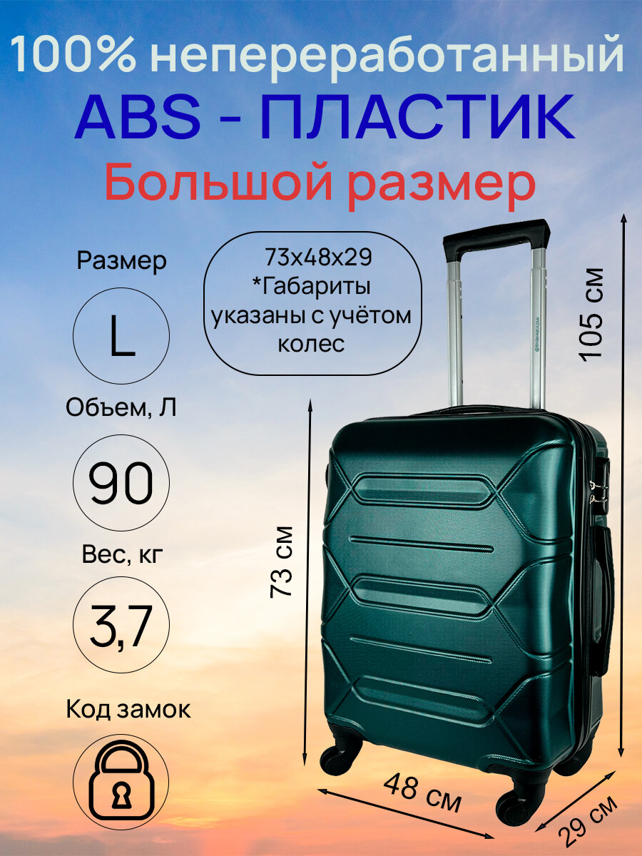 Чемодан, большой размер (L) 90 литров, Габариты: 73x48x29, кодовый замок, 4 колеса, Цвет: Темно-Зеленый информация: