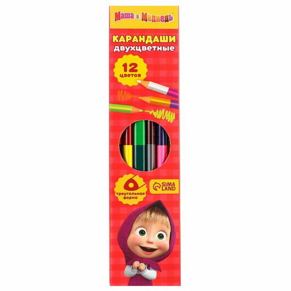 10 цен на Карандаши двухсторонние, 12 цветов, заточенные, трехгранные, картонная упаковка, европодвес, Маша и Медведь