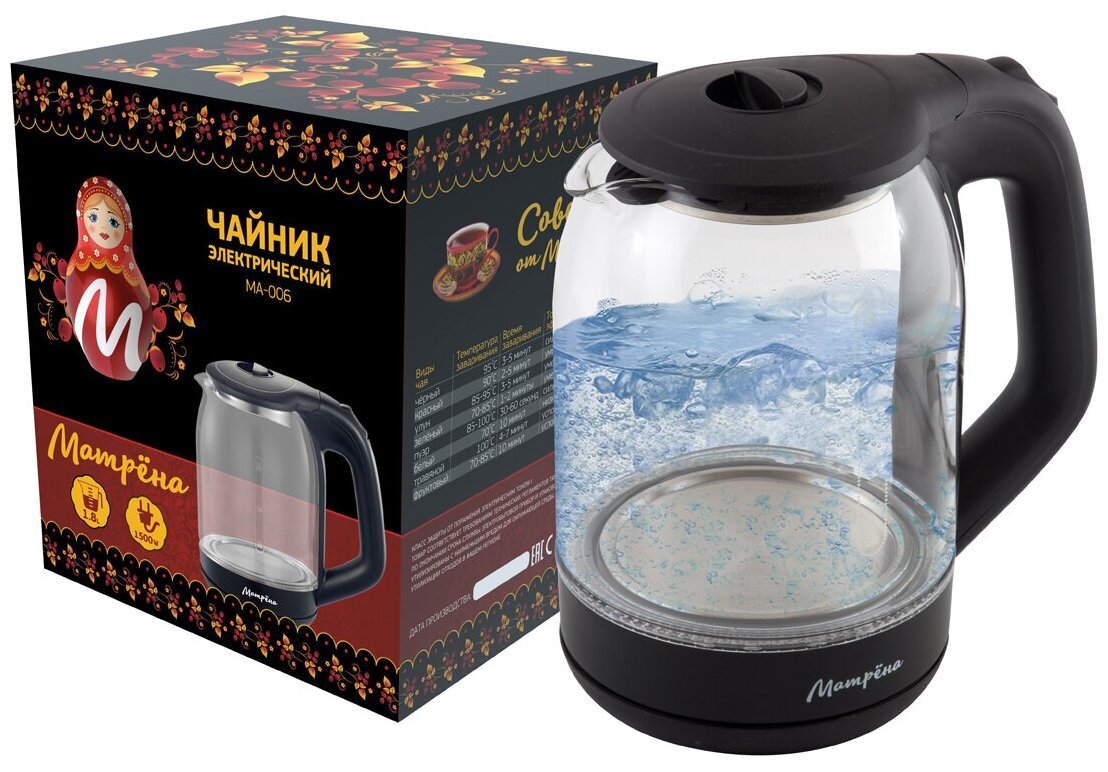 Чайник электрический матрёна MA-006, стекло черный информация: