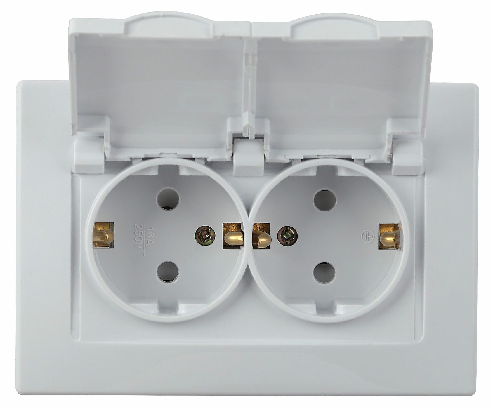 Розетка Intro Plano 1-210-01 с заземлением двойная 2х2P+E Schuko с крышкой шторками, 16А-250В, IP20, СУ, IP44, белый арт. Б0053934 (1 шт.)