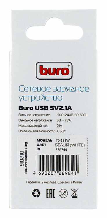 Сетевое зарядное устройство BURO TJ-159w, USB, 2.1A, белый