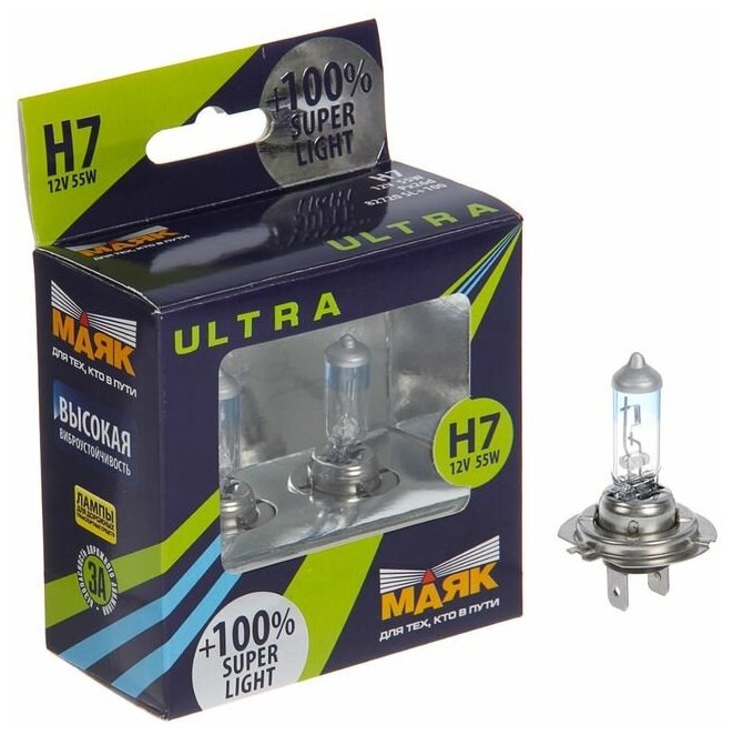 Лампа автомобильная Маяк Ультра Super Light+100%, H7, 12 В, 55 Вт, набор 2 шт информация: