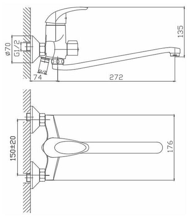 Смеситель на раковину настенный Эверест B46-350 с круглым поворотным изливом, кран-буксы 1/2", хром