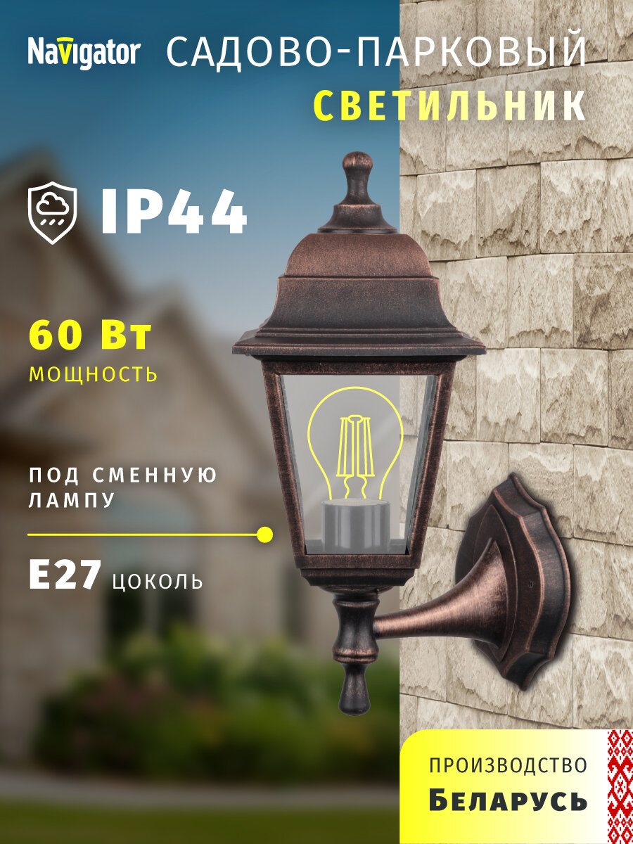 Светильник садовый настенный Navigator 80 490, 4 грани, черный под медь, цоколь E27, IP44 информация: