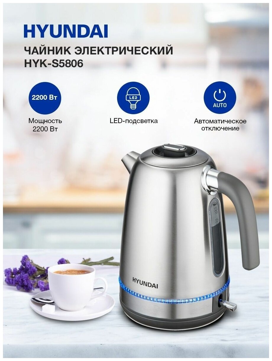 Чайник электрический Hyundai HYK-S5806, 1.7 л, 2200 Вт, серебристый матовый