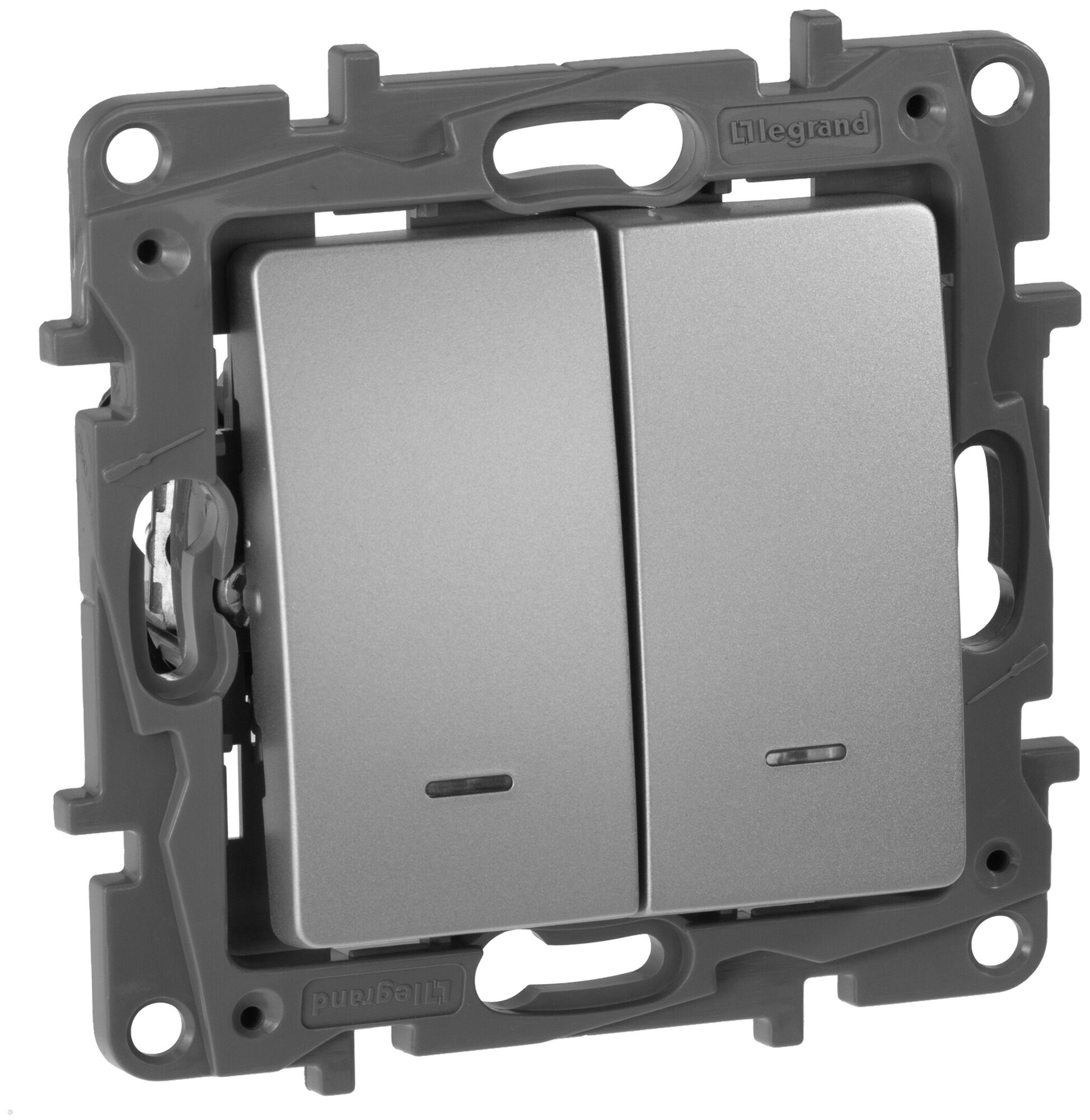Переключатель проходной двухклавишный с подсветкой 10AХ 250В Алюминий Legrand. Etika
