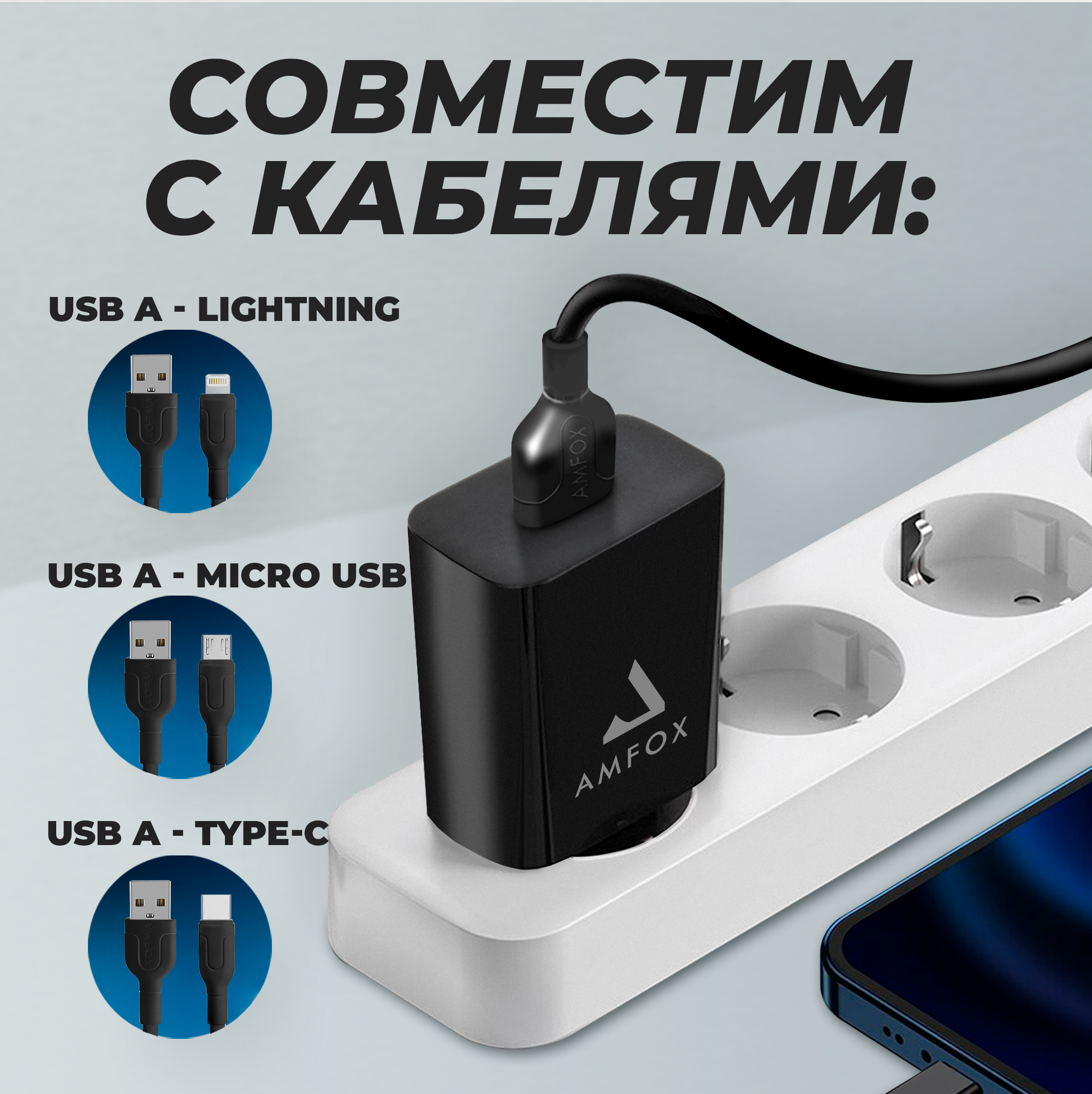 Универсальная сетевая зарядка для телефона, USBx1, 2.1А, 10.5 Вт, AMFOX, AH-45, черная / СЗУ, зарядное устройство, блок питания, блочок, адаптер