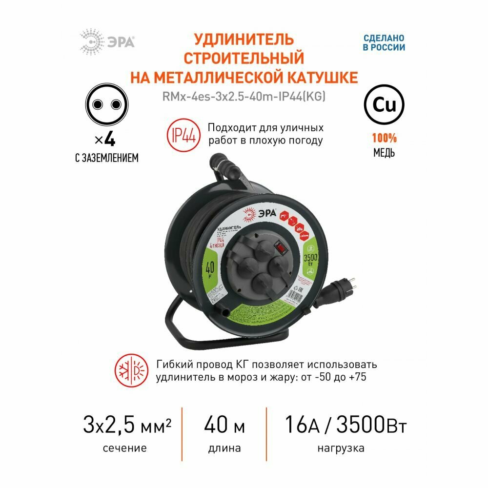 ЭРА RMx-4es-3x2.5-40m-IP44(KG) Удлинитель силовой на металлической катушке c/з 4 гн 40м КГ 3х2.5 информация: