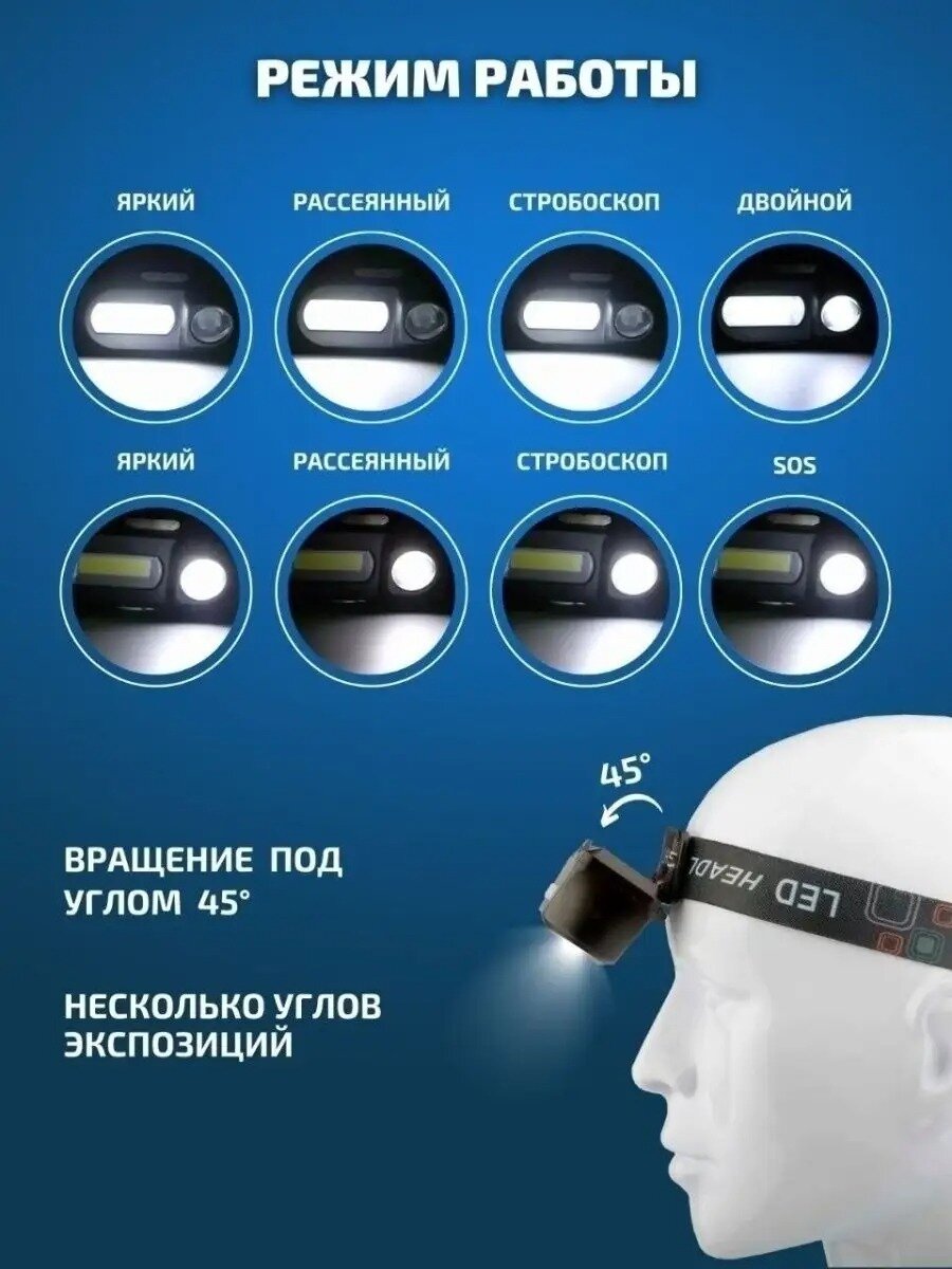 Фонарь налобный сверхяркий светодиодный мощный LED usb информация: