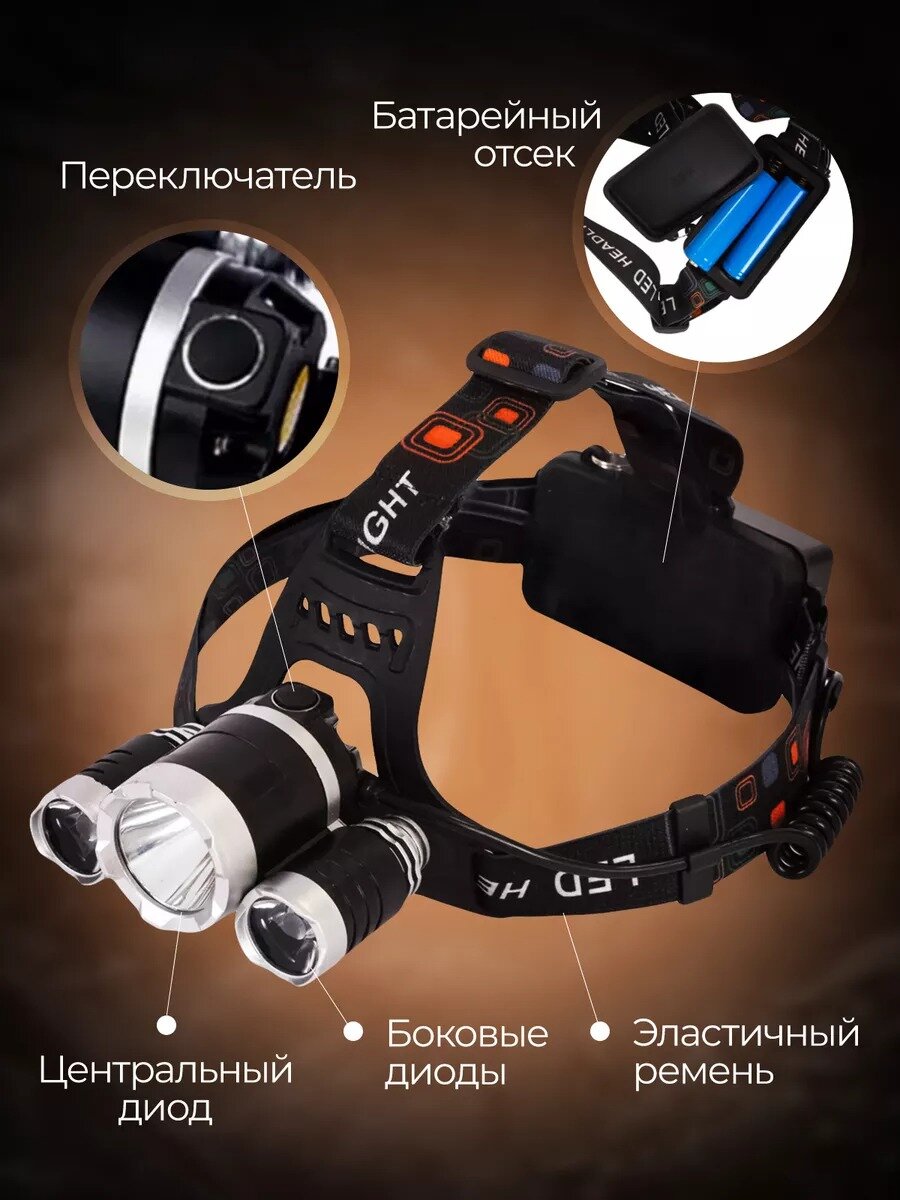 Сверхяркий популярнейший налобный фонарь аккумуляторный с тремя интегрированными фонарями и регулировкой угла аккумуляторный информация: