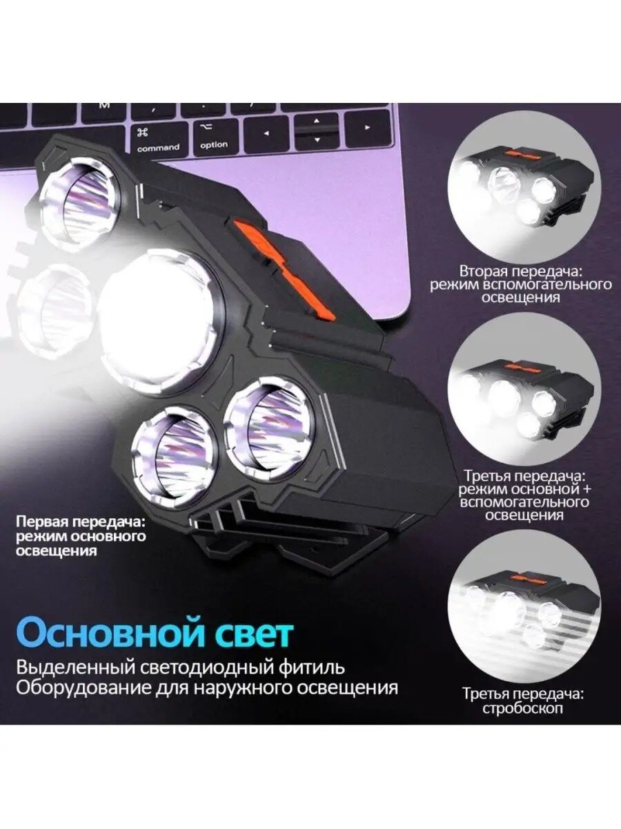 Сверхяркий популярнейший налобный фонарь аккумуляторный с тремя интегрированными фонарями и регулировкой угла аккумуляторный 539 ₽