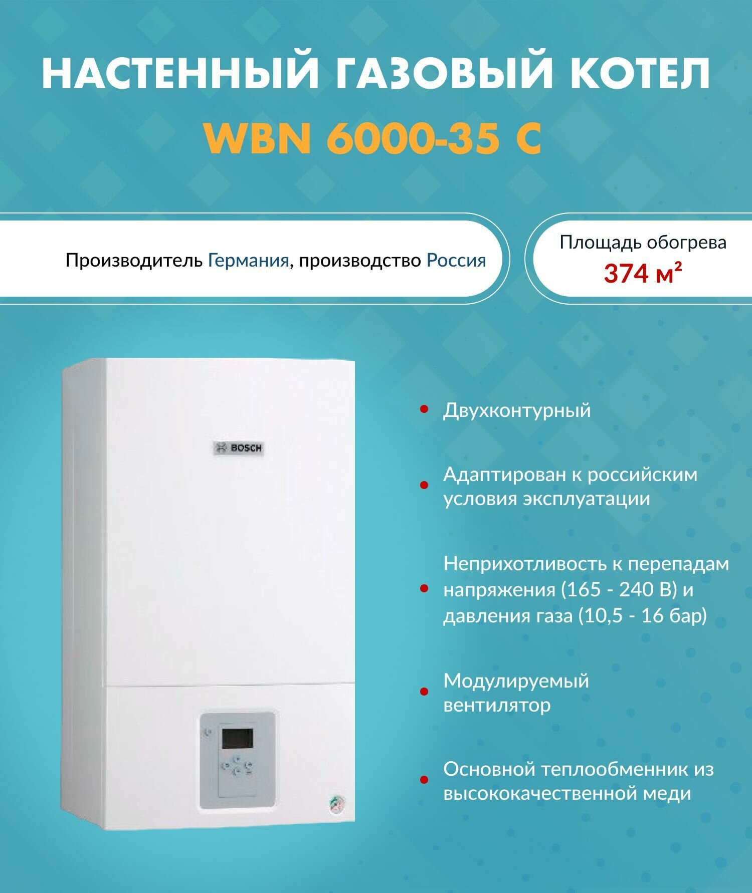 Конвекционный газовый котел Bosch Gaz 6000 W WBN 6000-35 CR N, 24 кВт, двухконтурный информация: