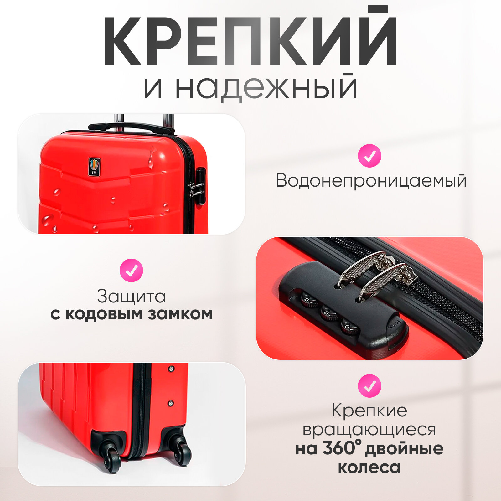 | Особенности конструкции | износостойкий, опорные ножки на боковой стенке, рифленая поверхность, выдвижная ручка,кодовый замок,4 колеса, вращающиеся на 360 градусов |