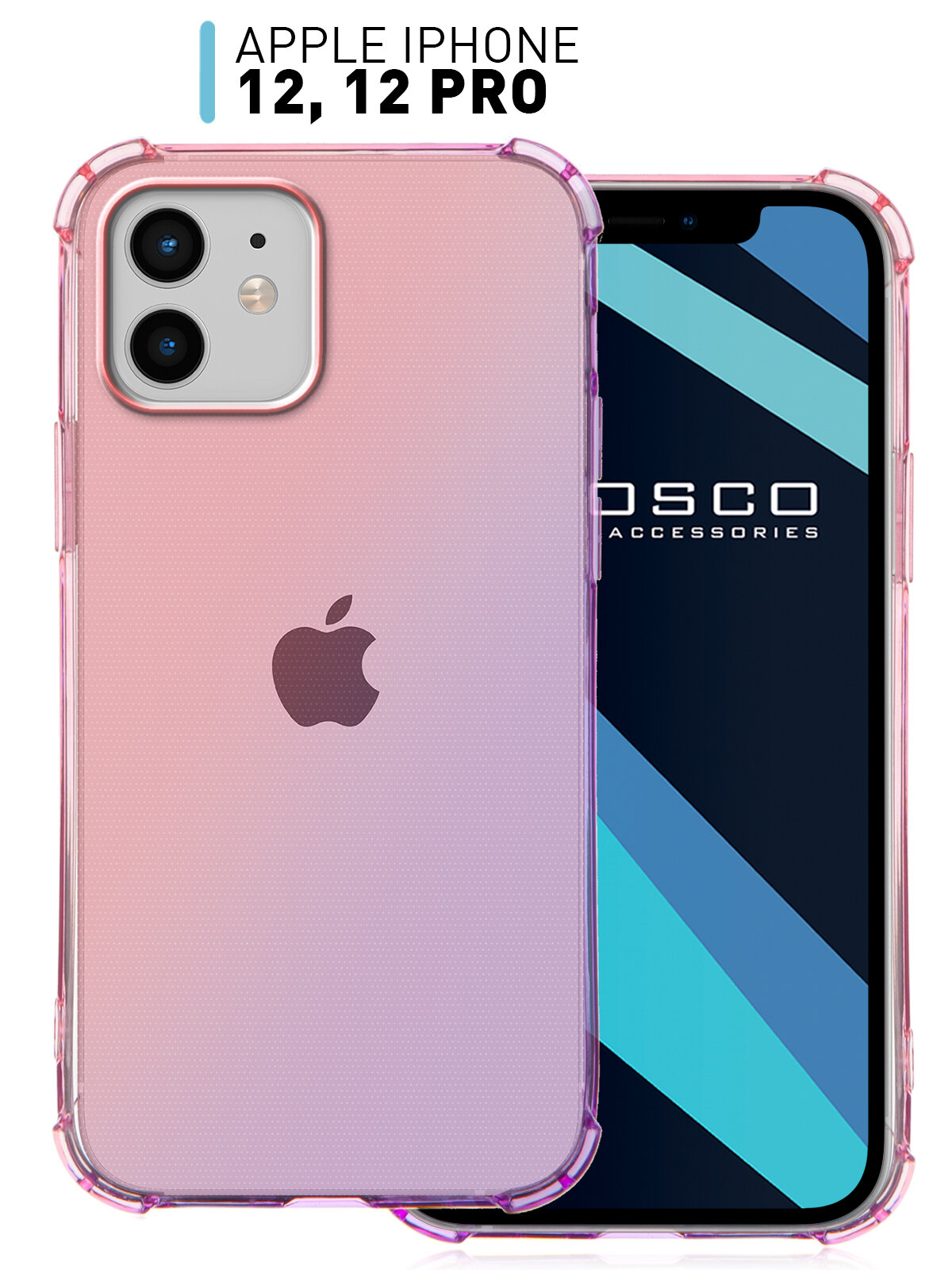 10 цен на Противоударный чехол на Apple iPhone 12, 12 Pro (Эпл Айфон 12, 12 Про) усиленные углы ROSCO, силиконовый с защитой камер, прозрачный розовый фиолетовый