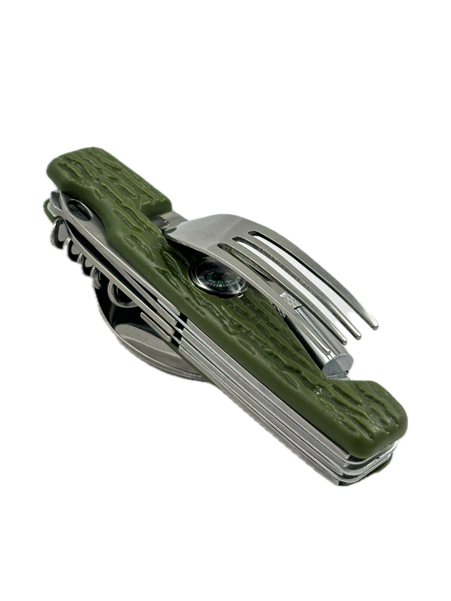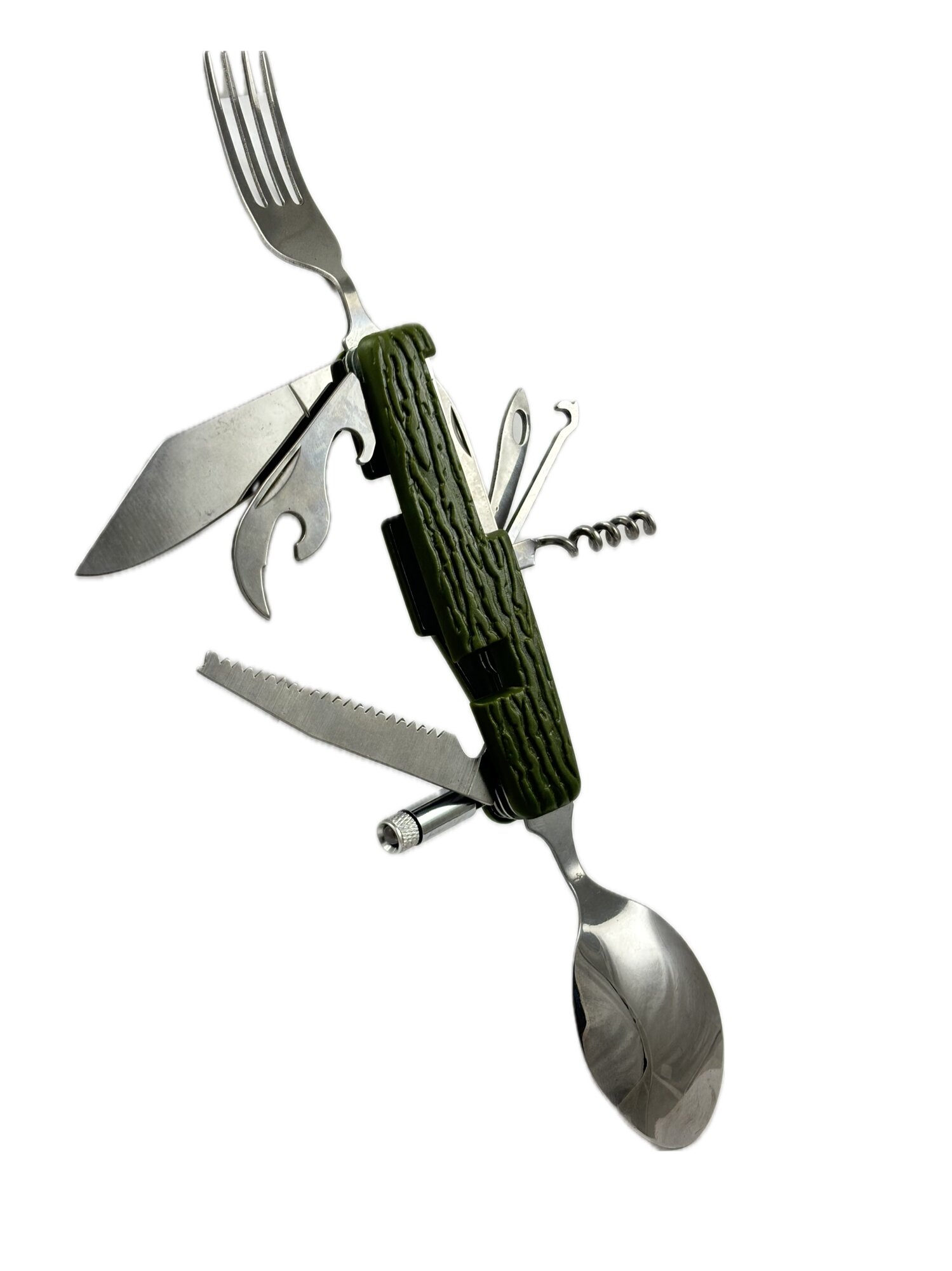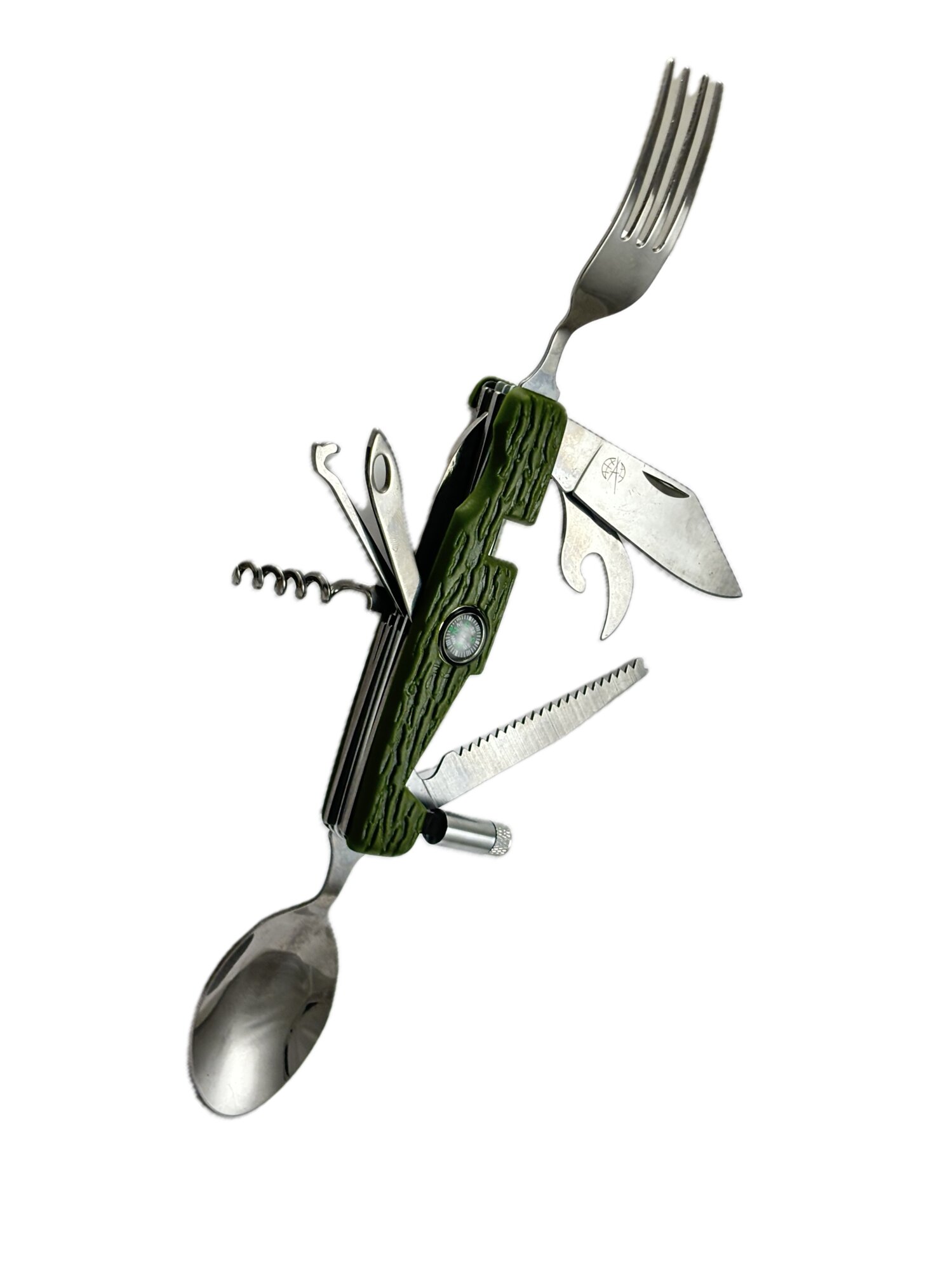 | Инструменты (функции) подробно | Комплектуется: ножом, ложкой, вилкой, пилой, крюком, шилом, консервным ножом, фонариком, штопором, дополнительно имеется компас в рукояти |